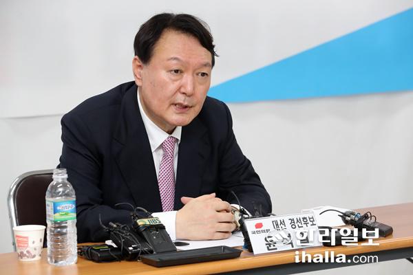 국민의힘 대선 경선 후보인 윤석열 전 검찰총장이 13일 오후 제주시 연삼로 국민의힘 제주도당사에서 기자간담회를 하고 있다.제주도사진기자회