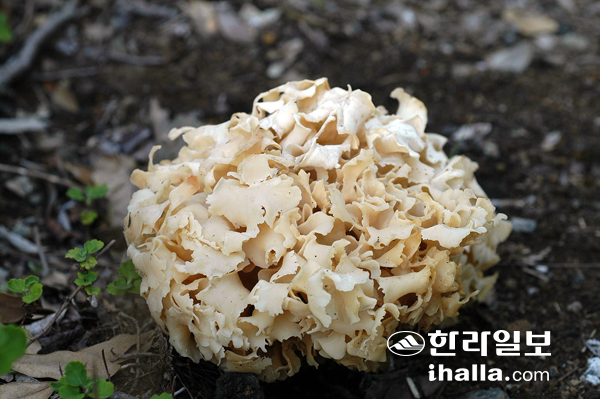 ▶꽃송이=꽃송이는 담갈색으로 물결치는 꽃잎이 다수 모인 것 같은 버섯이다. 덩어리의 지름이 10~30㎝로 하얀 양배추와 닮았고 아름답다.