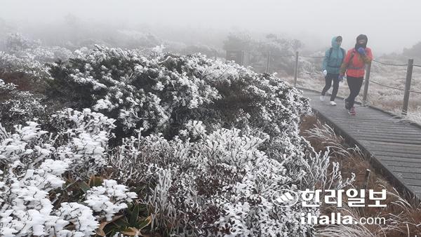 가을 비가 멈춘 후 북서쪽에서 찬 기운이 내려오면서 한라산 정상의 기온이 영하권을 보인 17일 한라산에 상고대가 활짝 피어 등반객들을 맞이하고 있다.