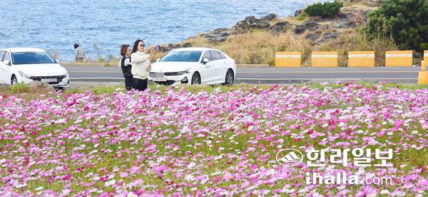 2일 제주시 애월해안도로 인근에 코스모스가 활짝 피면서 지나가는 관광객들의 발길을 붙잡고 있다.