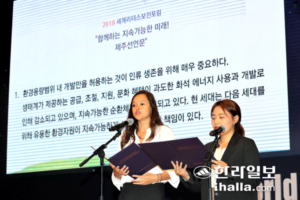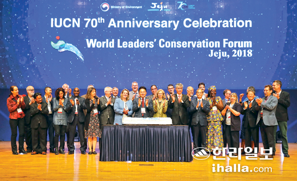 환경부는 '2018 세계리더스보전포럼' 폐막을 앞두고 제주도와 '제주 동북아 환경수도 비전 수립을 위한 협력 MOU'를 체결하고 적극 지원을 약속했다. 제주 동북아환경수도 비전 및 이행 계획의 수립·추진에 필요한 행정적·재정적 지원을 하기로 약속한 것이다. 보호지역 확대 및 환경자원총량제 도입, 탄소중립도시 실현, 폐기물감량 및 자원순환형 구조로의 전환, 물 순환 환경 조성과 지하수 보전 관리, 녹색일자리 창출을 위한 4차산업 기술 활용, 국제보호지역 연구훈련센터 설립·운영, 동북아환경수도 조성을 위한 관련법의 제·개정 등 7개 분야에 대해서도 협력키로 했다.