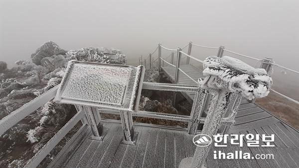 실제 한라일보 취재진이 9일 아침 한라산을 등반한 결과 족은윗세오름 정상을 중심으로 첫눈과 상고대가 확인됐다. 올해 한라산 첫눈은 지난해 11월29일보다 20일가량 빠른 것이다.