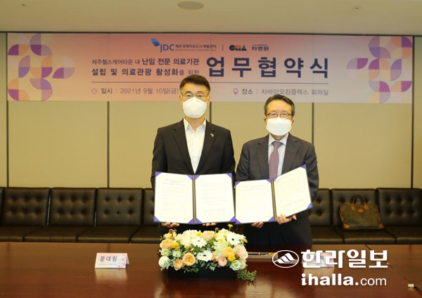 | JDC는 지난 9월 10일 차병원·바이오 그룹 본사인 차바이오컴플렉스에서 문대림 JDC 이사장, 차광렬 차글로벌연구소장, 등이 참석한 가운데 차병원·바이오 그룹과 헬스케어타운 내 난임 전문의료기관 설립을 위한 업무협약을 체결했다. |