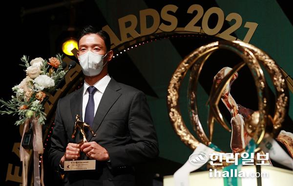 베테랑 수비수 홍정호는 7일 오후 서울 서대문구 스위스그랜드호텔에서 열린 하나원큐 K리그1 2021 대상 시상식에서 최우수선수(MVP)의 영예를 안았다.