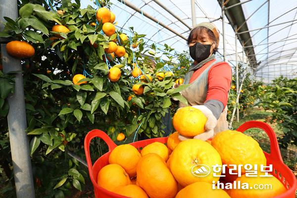7일 제주 애월읍의 한 감귤 농장에서 농민이 농촌진흥청 국립원예특작과학원이 개발한 국산 만감류 '윈터프린스'를 수확하고 있다.