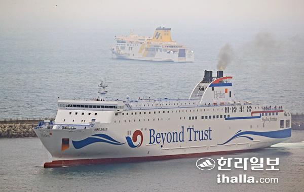인천과 제주를 잇는 여객선 '비욘드 트러스트호(2만7천t급)'가 11일 오전 제주항에 입항해 승객들이 하선하고 있다. 이 여객선은 2014년 세월호 참사 이후 7년 만에 해당 항로를 운항하는 여객선으로 지난 10일 인천에서 처음으로 공식 출항했다.