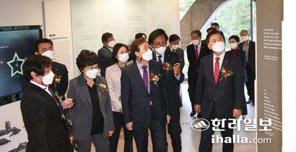 지난 10월 제주문학관 개관식에 참석한 내빈들이 제주문학의 어제와 오늘을 담은 전시실을 둘러보고 있다. 한라일보DB
