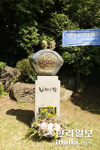 지난해 5월 천주교 제주교구·신축항쟁 기념사업회 공동 명의로 제주시 화북2동 황사평 묘역에 세워진 '화해의 탑'. 두 인물상 중 한 명은 라크루 신부를 모델로 했다. 한라일보DB