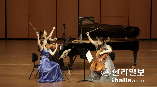 | 지난 20일 제주국제실내악페스티벌 메인 공연 첫날 지난해 제주국제실내악콩쿠르 전체 대상인 '르포렘 트리오'가 첫 무대를 열고 있다. 사진=제주아트센터 |