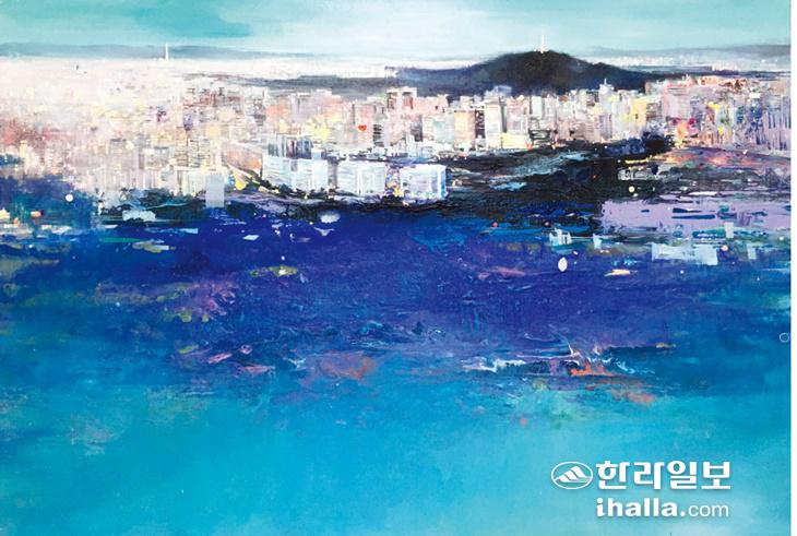 고향 제주를 떠나 낯선 도시에서 일상을 보내던 작가는 어느 날 그 거리에서 "신기루 같은 제주의 풍경"이 떠올랐다. 서울 대도시의 빌딩숲 아래 짙푸른 제주 바다가 자리 잡고 있는 화면은 그날의 기억이 확장된 결과다.