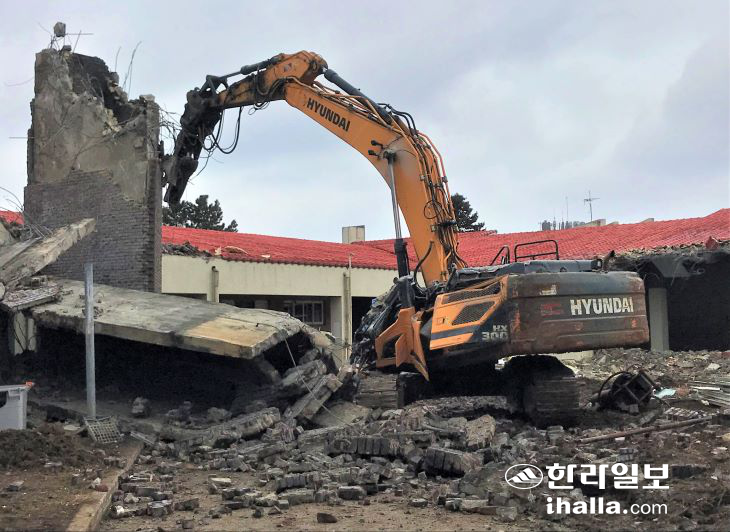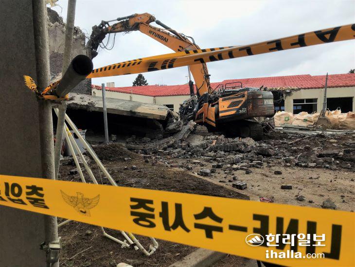23일 오전 제주대학교 생활관 공사 철거 현장에서 굴뚝이 무너지며 굴착기 운전자 1명이 사망했다. 김도영기자