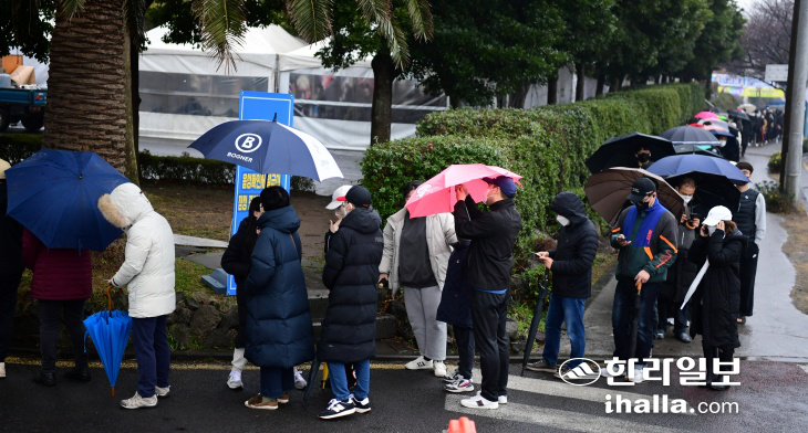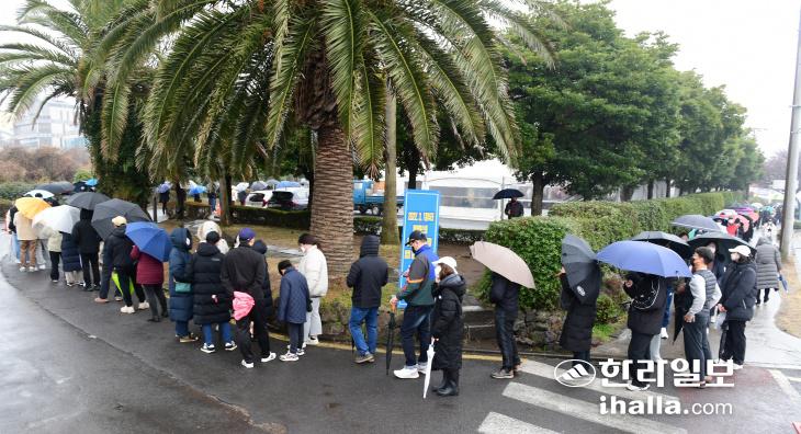 | 1일 제주보건소 선별진료소에는 비 날씨에도 코로나19 검사를 받으려는 시민들이 긴 행렬을 이루고 있다. 강희만기자 |