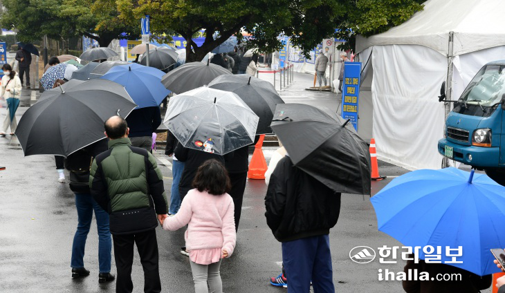 1일 제주보건소 선별진료소에는 비 날씨에도 코로나19 검사를 받으려는 시민들이 긴 행렬을 이루고 있다. 강희만기자