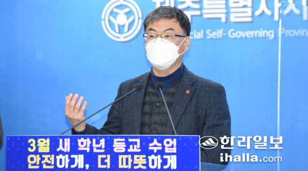 | 김영관 제주도교육청 학생인권교육센터장이 21일 도교육청 기자실에서 최근 이뤄진 도내 A고 학생인권침해실태 기자회견과 진정서 제출에 대한 후속조치를 발표하고 있다. 이상국기자 |
