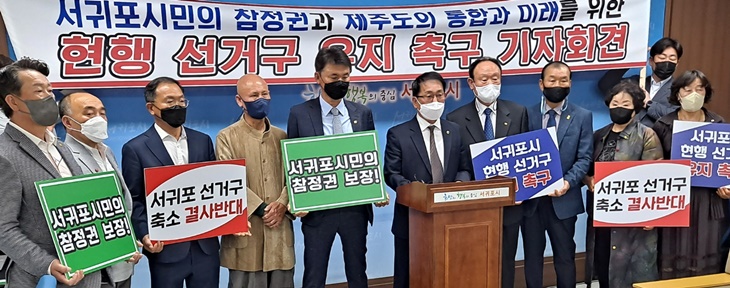 서귀포시 시민사회 25개 단체도 이날 서귀포시청 기자실에서 기자회견을 열어 현행 서귀포 선거구를 유지해야한다고 주장했다.