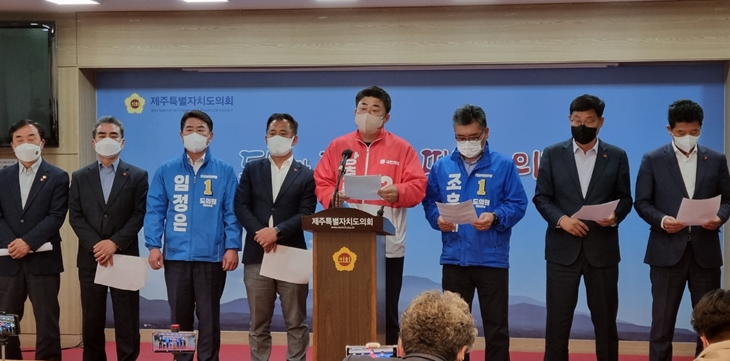 더불어민주당 고용호·김대진·김용범·임정은·조훈배·송영훈 의원과 국민의힘 강연호·강충룡·이경용 의원, 무소속 양병우 의원 등 서귀포시 지역구 도의원 10명은 19일 제주도의회 도민카페에서 기자회견을 열어 서귀포시 지역구 1곳을 통폐합하는 방안에 대해 "제주특별자치도 출범시 약속한 불이익 배제의 원칙을 위반한 것"이라고 비판했다.