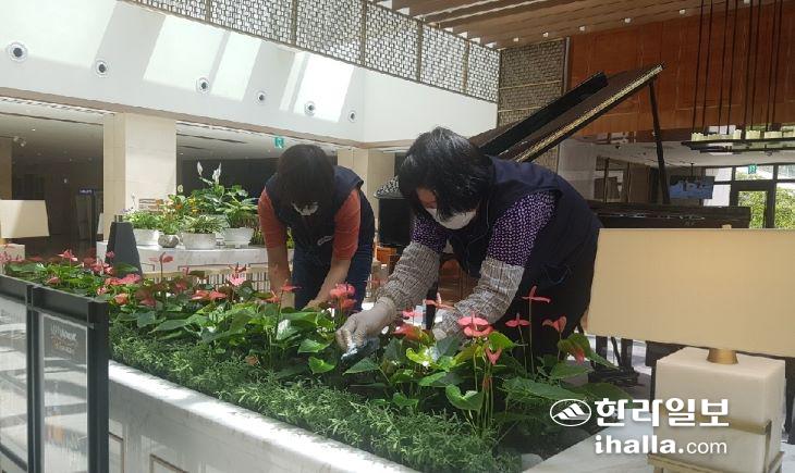 제주신화월드 내 실내 조경 작업을 진행하고 있는 행복공작소 직원들.