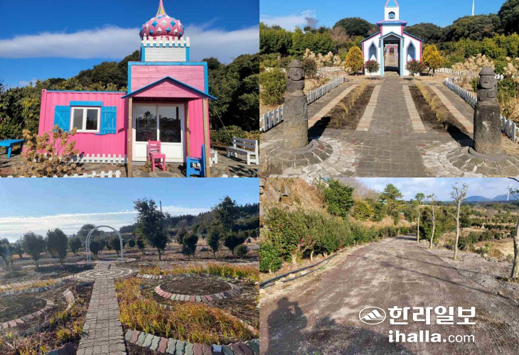| 관광농원을 개발하기 위해 A씨가 무단 훼손한 임야에 설치된 보도블록과 조형물 등. 사진=자치경찰단 |