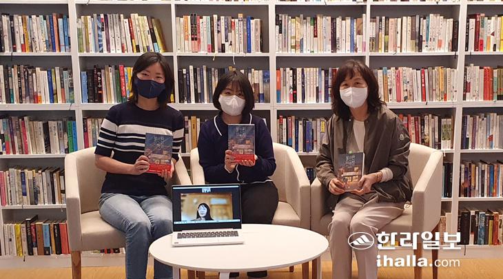 제주문학관에서 진행된 북클럽 대담 장면. 왼쪽부터 고은영·정혜원·김은희씨. 성현아씨는 온라인으로 함께했다. 서귀포시민의책읽기위원회