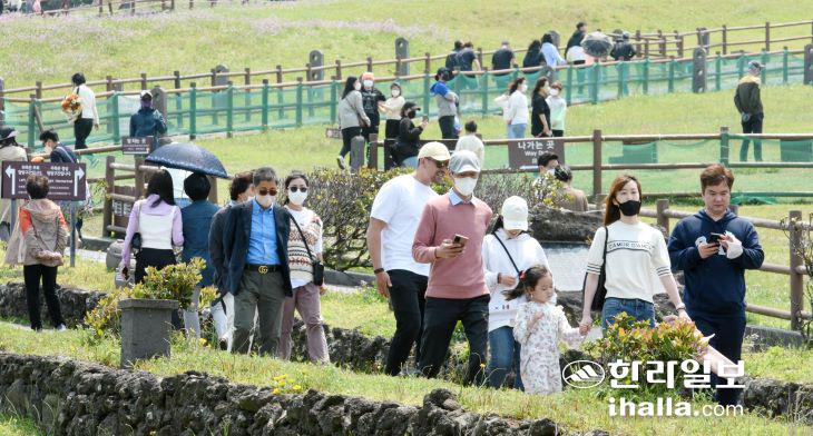 이날 서귀포시 성산일출봉을 찾은 관광객들도 90% 이상 마스크를 착용했다. 실외지만 사람들이 몰리는 장소이다 보니 마스크를 착용하는 것이 안심이 된다는 의견이 많았다.