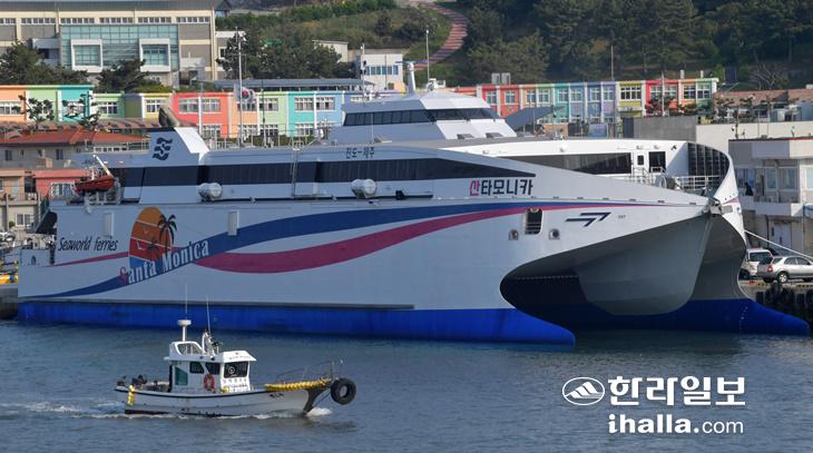 추자도 사람들의 숙원이던 3000t급 이상 여객선이 이달 7일 취항한다. 씨월드고속훼리㈜는 전남 진도항과 제주항을 연결하는 산타모니카호 신규 취항을 앞두고 2일 추자항 등에서 시범 운항에 나섰다.