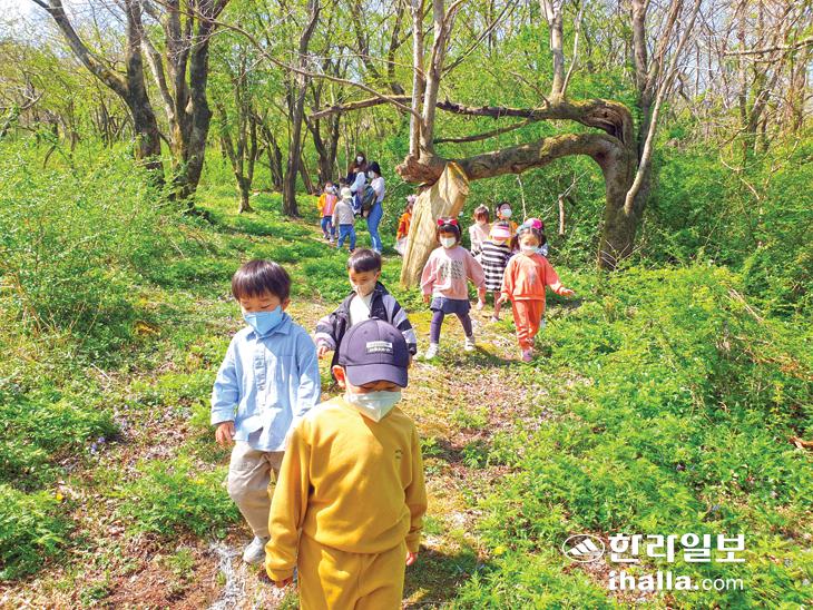 애월읍 수산봉 유아동네숲터를 찾은 아이들. 유아동네숲터는 제주시의 중점 시책인 아동친화도시 사업으로 조성됐다.
