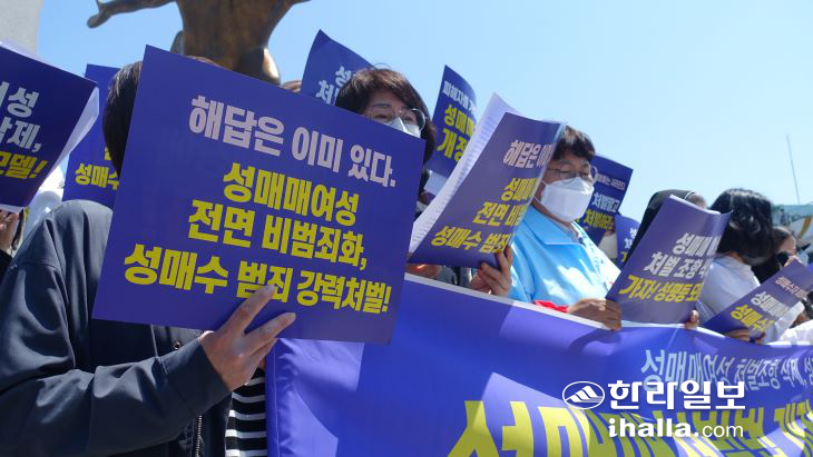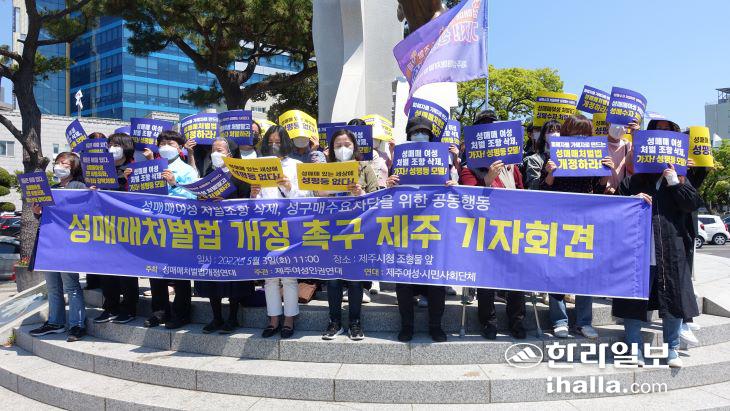 제주 지역 14개 정당 및 시민단체가 모인 제주성매매처벌법개정연대(이하 개정연대)는 3일 제주시청 앞에서 기자회견을 열고 "성매매 처벌법을 개정해 성매매 범죄 강력 처벌하고 성매매 여성 처벌 조항 삭제해 성매매 여성 비범죄화하라"고 말했다.