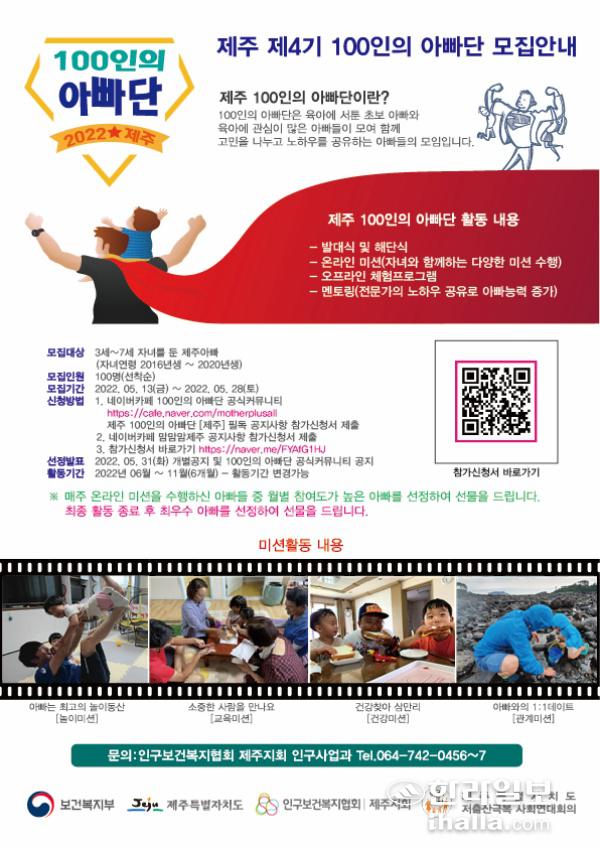 제주특별자치도와 인구보건복지협회 제주지회가 이달 13일부터 28일까지 '제주 100인의 아빠단'을 모집한다.