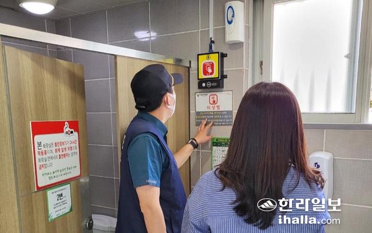 제주시가 경찰, KT와 협업으로 공중화장실 안심 비상벨 정상 작동 여부 등을 점검하고 있다. 사진=제주시