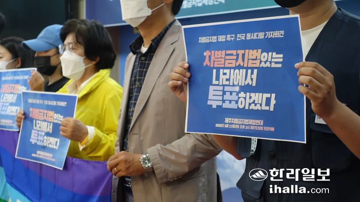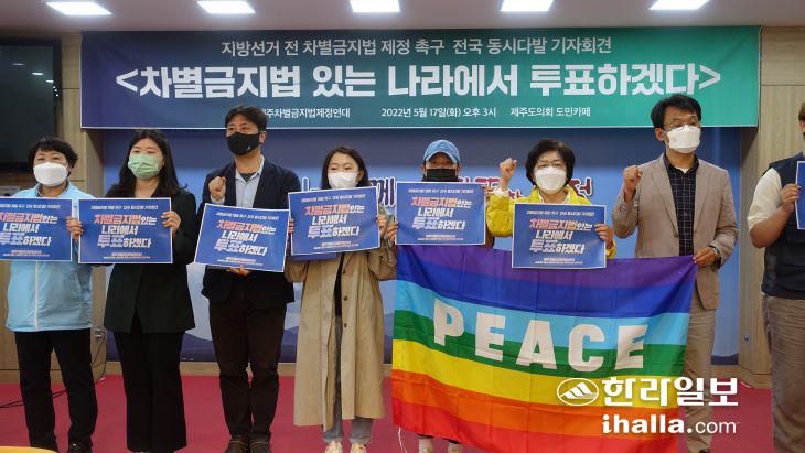 제주지역 19개 정당과 시민단체가 연대한 제주차별금지법제정연대(이하 제정연대)는 17일 제주도의회 도민카페에서 전국 동시다발 기자회견을 열고 "차별금지법 있는 나라에서 투표하겠다 국회는 차별금지법 즉각 제정하라"고 말했다.