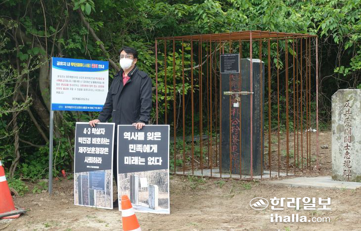 제주4·3기념사업위원회 관계자 등은 이날 행정대집행에 앞서 '4·3 학살자 박진경 비호하는 제주보훈청장은 사퇴하라', '역사를 잊은 민족에게 미래는 없다' 등의 피켓을 들고 시위를 벌이기도 했다.