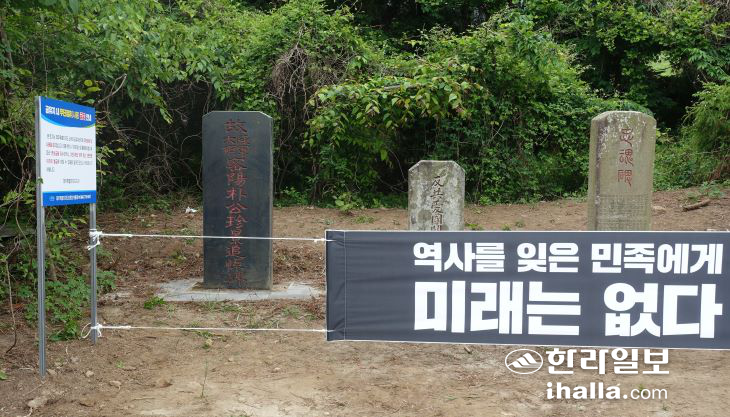 앞서 제주4·3기념사업위원회 등 16개 시민사회단체는 지난 3월 10일 박진형 대령 추도비에 '역사의 감옥에 가두다'라는 제목의 조형물은 설치했다. 이는 4·3 당시 민간인 학살을 자행했던 박진경을 추모하는 행위 자체가 그 역사를 부정하는 것이라는 판단에서 이뤄졌다.