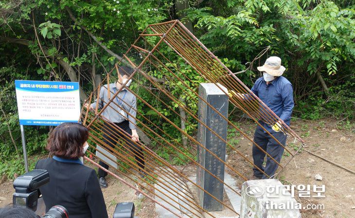 제주도보훈청은 20일 오후 2시 제주시 연동 어승생한울누리공원 인근 도로변 박진경 추도비에 설치된 철창 형태의 조형물에 대한 행정대집행을 실시했다.