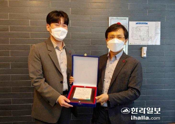 도지사 표창을 받고 있는 윤진수 제주사회복지공동모금회 모금사업팀 주임.