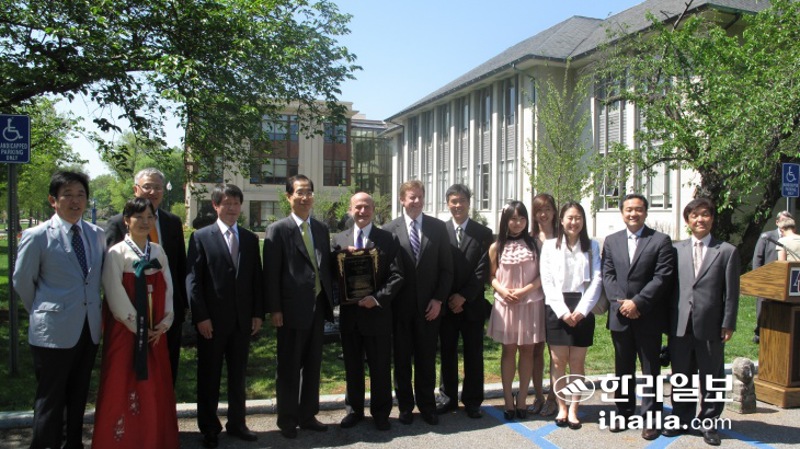| 2011년 4월 25일(현지시각) 미국 수도 워싱턴D.C. 아메리칸대학교에서 열린 한국정원 조성 기념식에서 아메리칸대학교와 주미한국대사관, 국립산림과학원 등 관계자들이 기념사진을 촬영을 하고 있다. 사진 왼쪽에서 다섯번째가 당시 주미대사이던 한덕수 국무총리. 한라일보 DB |