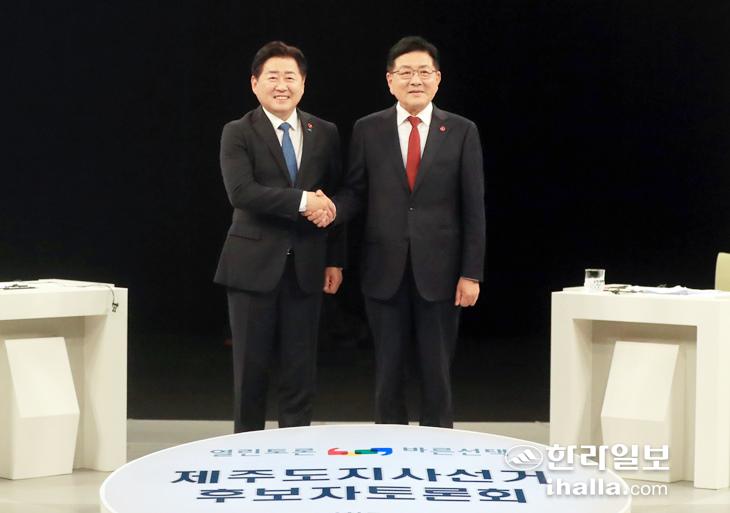 제주도 선거방송토론위원회는 23일 밤 제주KBS1TV·제주MBC·JIBS제주방송에서 더불어민주당 오영훈, 국민의힘 허향진 후보 등 제주도지사 후보 초청 토론회를 열었다.