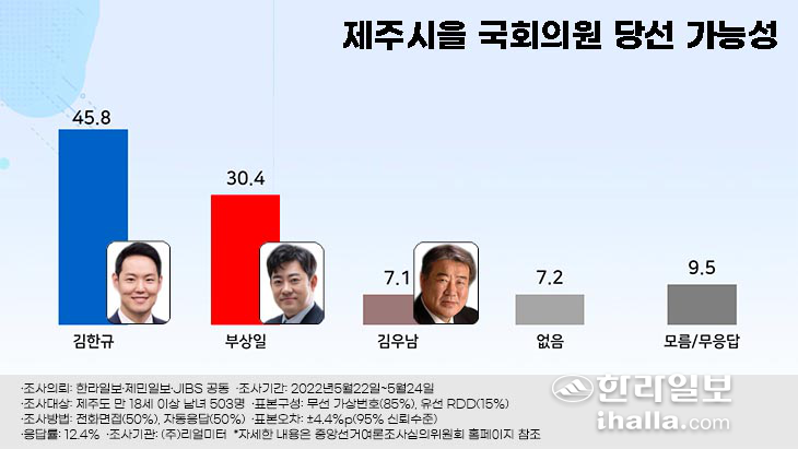 이번 제주시을 국회의원 보궐선거에 출마한 후보 중 누구에게 투표하겠는지를 물은 결과, 더불어민주당 김한규 후보가 41.4%, 국민의힘 부상일 후보는 33.3%를 나타냈다. 두 후보 간의 차이는 오차범위(±4.4%) 내인 8.1%p(포인트)로 조사됐다. 무소속 김우남 후보는 8.8%를 보였다.