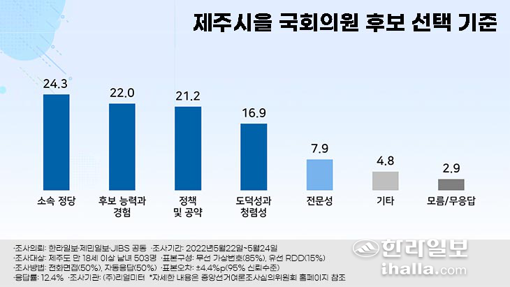 특히 제주도민들은 제주시을 국회의원 후보 선택 시 후보의 소속 정당을 가장 중요한 기준으로 고려하는 것으로 나타났다. 제주시을 국회의원 선거에서 누구를 뽑을 지 결정할 때 가장 중요하게 고려하는 것은 무엇인지 물은 결과, '소속 정당'이 24.3%로 가장 높았으며, '후보 능력과 경험'이 22.0%, '정책 및 공약'이 21.2%, '도덕성과 청렴성'이 16.9%의 순으로 나타났다. '전문성'은 7.9%로 가장 낮았고 '기타' 4.8%, '모름 또는 무응답'은 2.9%로 집계됐다.