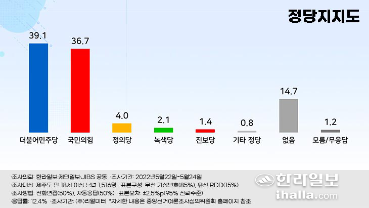 정당 지지도 조사 더불어민주당 39.1%·국민의힘 36.7%