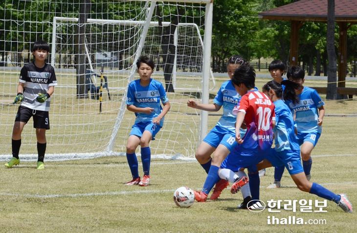 27일 경북 구미낙동강체육공원 3구장에서 열린 제51회 전국소년체육대회 13세 이하부 여자축구 예선전에서 제주선발이 충북 남산초와 예선전을 펼치고 있다.