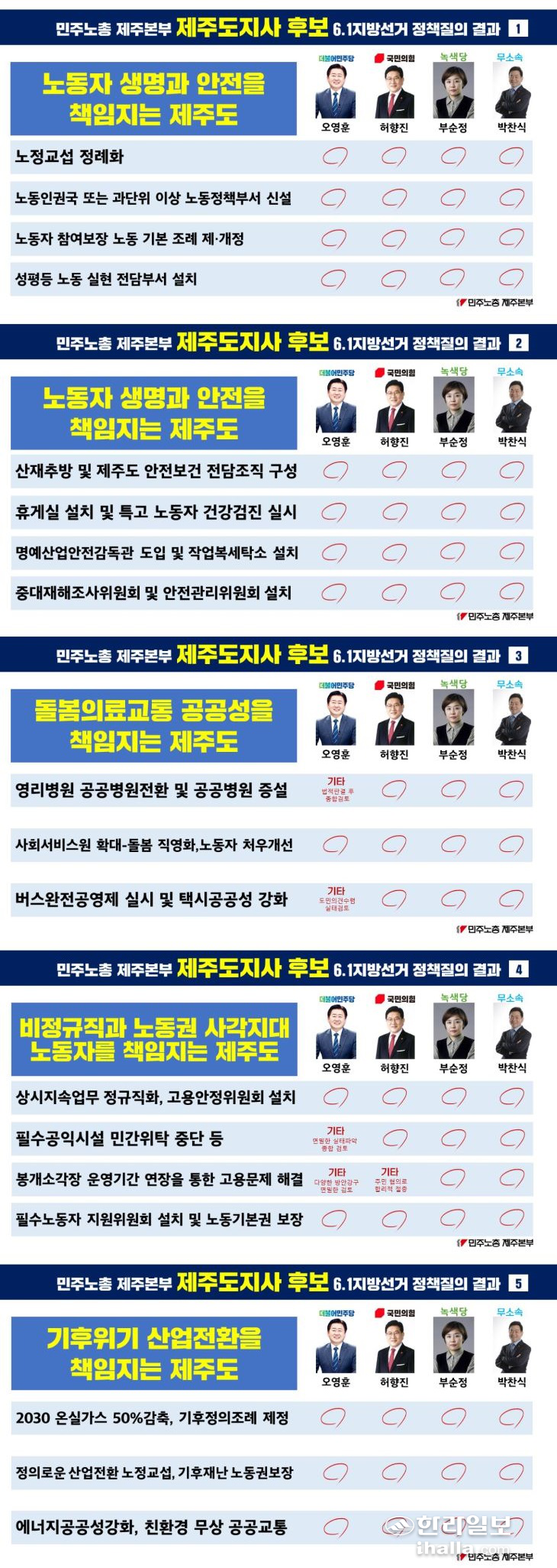 민주노총은 제주도지사 후보에게 ▷노동정책을 책임지는 제주도 실현을 위한 정책과제 ▷노동자 생명과 안전을 책임지는 제주도 실현을 위한 정책과제 ▷돌봄, 의료 공공성을 책임지는 제주도 실현을 위한 정책과제 ▷저임금·노동권 사각지대 노동자를 책임지는 제주도 실현을 위한 정책과제 ▷기후 위기-산업 전환을 책임지는 제주도 실현을 위한 정책과제 등의 세부내용을 담아 질의했다.