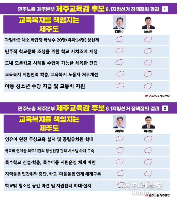 한편 제주도교육감 후보에 대해서는 교육복지정책과 관련한 10개의 정책질의를 진행했으며 김광수·이석문 후보 모두 100% 동의 의견을 밝혀 제주교육복지 증진에 '청신호'가 켜졌다고 민주노총은 분석했다.