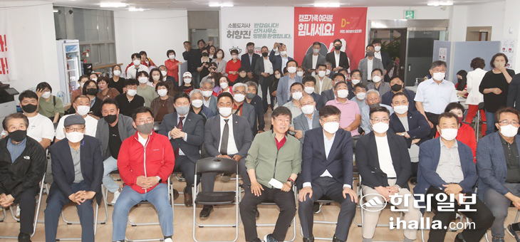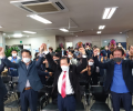 | 제8회 전국동시지방선거 출구조사가 발표된 1일 오후 7시30분 오영훈 후보(위) 캠프와 허향진 후보(아래) 캠프의 희비가 엇갈리고 있다. 강희만기자 |