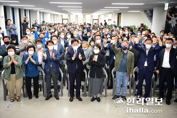1일 SBS와 KBS, MBS 등 지상파 3사가 공동으로 실시한 출구조사 결과가 발표되자 오영훈 후보 캠프에서는 환호가 터져나왔다. 강희만기자