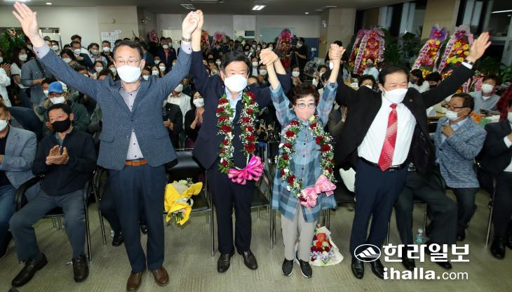 김광수 제주도교육감 후보가 당선 확정 직후 축하 연호에 화답하고 있다. 강희만기자