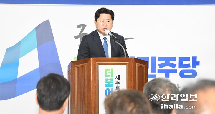 2일 열린 더불어민주당 제주도당 선대위 해단식에서 발언하는 오영훈 제주지사 당선인. 이상국 기자
