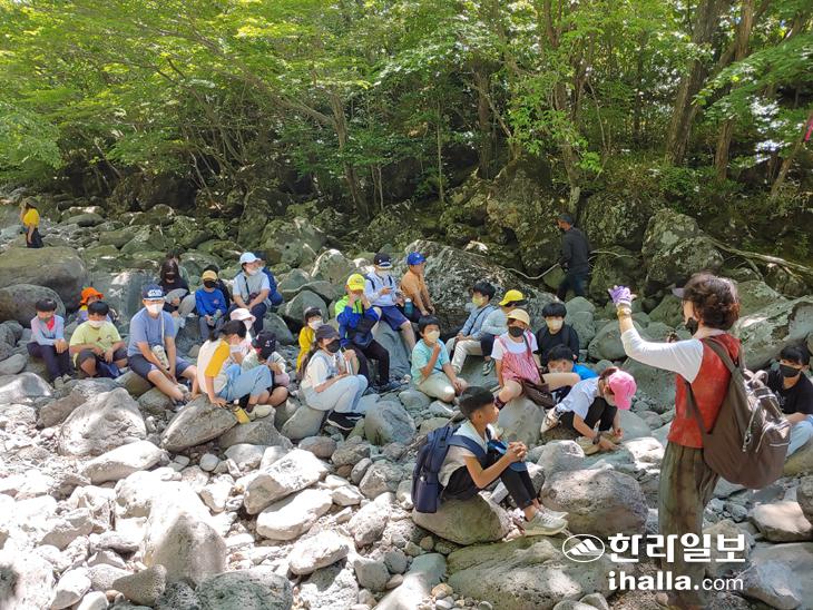 동백길 탐방에 나선 무릉초 3~4학년 학생들이 하천 바위에 앉아 제주의 물 이야기를 듣고 있다.