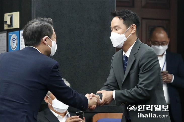 6.1 보궐선거에서 제주시을에 당선된 더불어민주당 김한규 의원이 7일 오후 서울 여의도 국회에서 열린 의원총회에 첫 참석해 의원들과 인사를 나누고 있다.