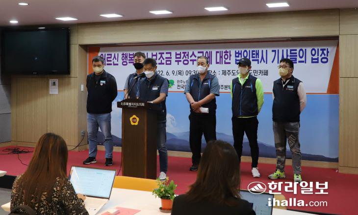 전국민주택시노동조합 제주본부(이하 택시노조 제주본부)는 9일 제주도의회 도민카페에서 기자회견을 열고 '어르신 행복택시 부정수급 문제에 대한 제주도 법인택시 기사들의 입장'을 발표했다.