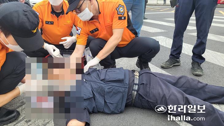 10일 제주경찰청 등에 따르면 이날 오후 2시25분쯤 제주항 5부두 앞 횡단보도에서 총파업 관련 선전물을 나눠주던 민주노총 전국공공운수노동조합 화물연대 조합원이 화물 트럭에 치였다.